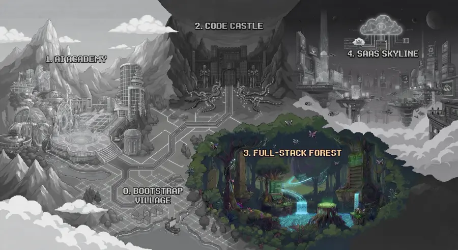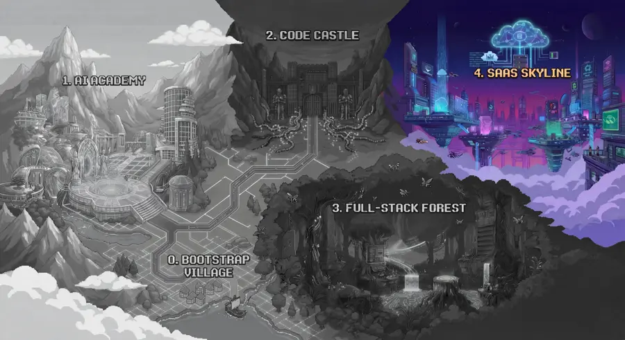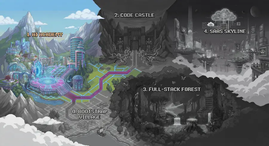 A gleaming futuristic city where code becomes commerce. Thirteen districts span from the Startup Hub to the Launch Pad, covering everything from AI-powered features to native mobile development to cloud infrastructure to business formation. Architect Zero built the first tower alone using the Vibe Protocol. The Old Guard's influence is fading — this is where you prove they were wrong about who can build technology.